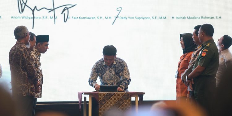 Rangkaian acara kemudian dilanjutkan dengan prosesi penandatanganan Komitmen Bersama oleh Bupati Tegal Ischak Maulana Rohman bersama Gubernur Jawa Tengah Ahmad Luthfi dan seluruh bupati serta wali kota se-Jawa Tengah.