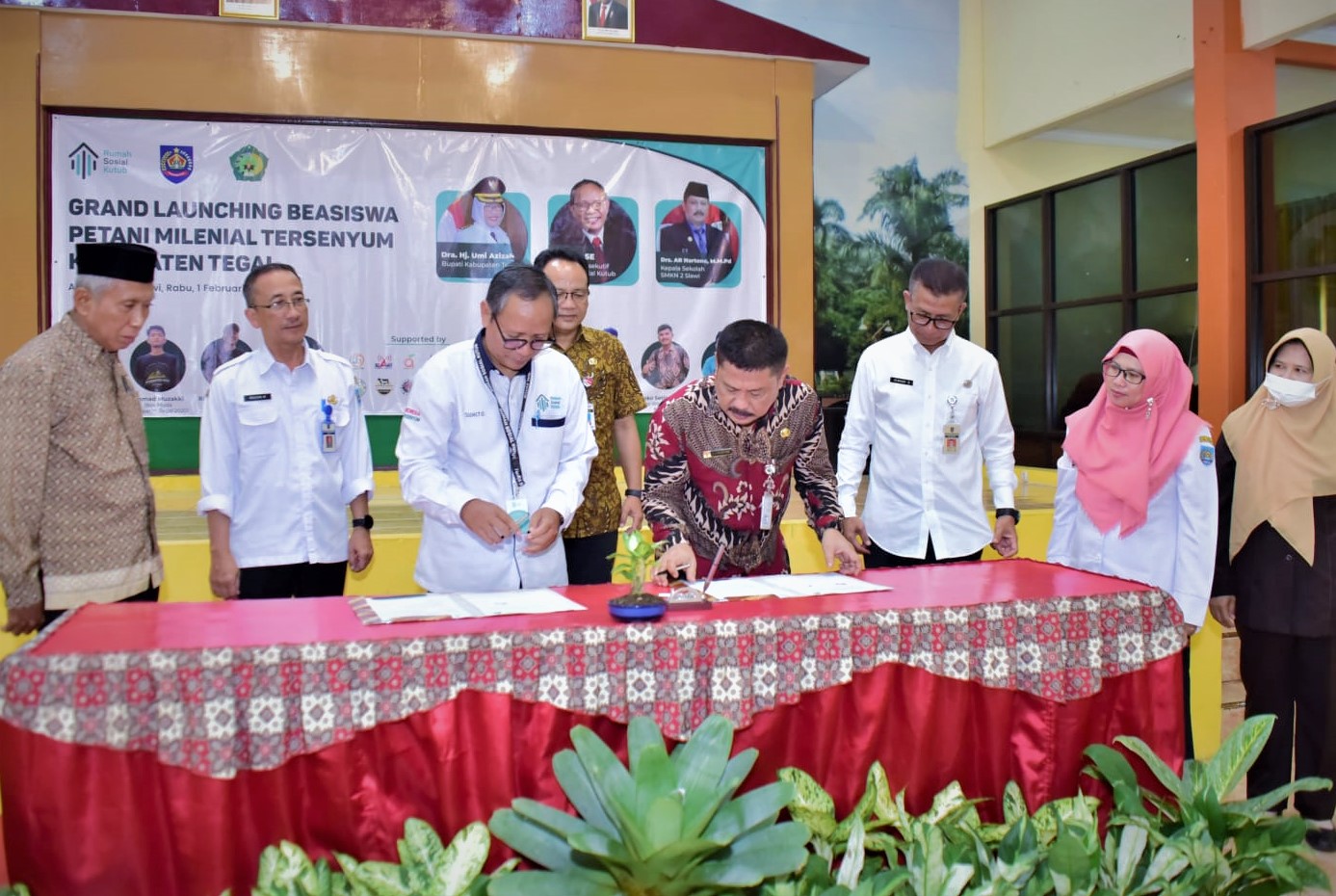 Slawi – Dinilai mampu dan teruji dalam mengelola lahan pertanian seluas 1.500 meter persegi, empat siswa asal SMK Negeri 2 Slawi berhak meraih beasiswa Petani Milenial Tersenyum dari lembaga sosial Rumah Sosial Kutub. Penyerahan beasiswa berupa pendampingan dan pinjaman lahan garap pertanian berikut fasilitas green housenya untuk bercocok tanam ini disaksikan oleh Asisten Bidang Perekonomian Sekda Kabupaten Tegal Hendadi Setiaji di Gedung Sena Ayu Graha SMK Negeri 2 Slawi, Rabu (02/02/2023).