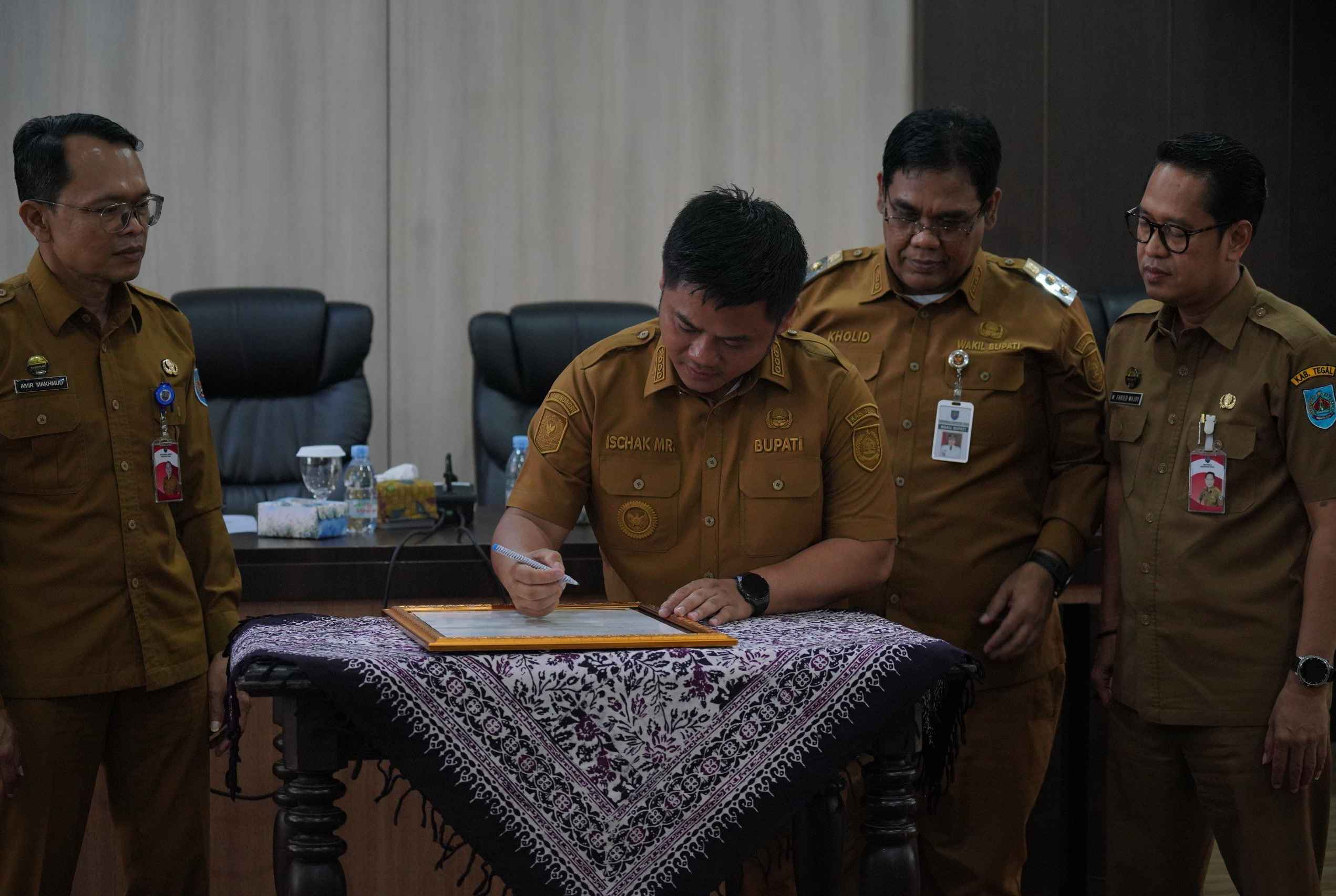 Bupati Tegal Ischak Maulana Rohman saat menandatangai komitmen antikorupsi dalam pengarahan antikorupsi yang digelar di Ruang Rapat Bupati, Sekretariat Daerah Kabupaten Tegal, Selasa (07/04/2026).