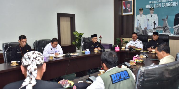 Bupati Tegal Ischak Maulana Rohman memimpin rapat untuk memastikan kesiapsiagaan menghadapi ancaman banjir dan longsor. Dalam forum tersebut dibahas pula dukungan dari berbagai pihak, termasuk distribusi paket sembako dan relokasi lahan terdampak, guna menjamin pemenuhan kebutuhan dasar masyarakat di tengah potensi cuaca ekstrem.