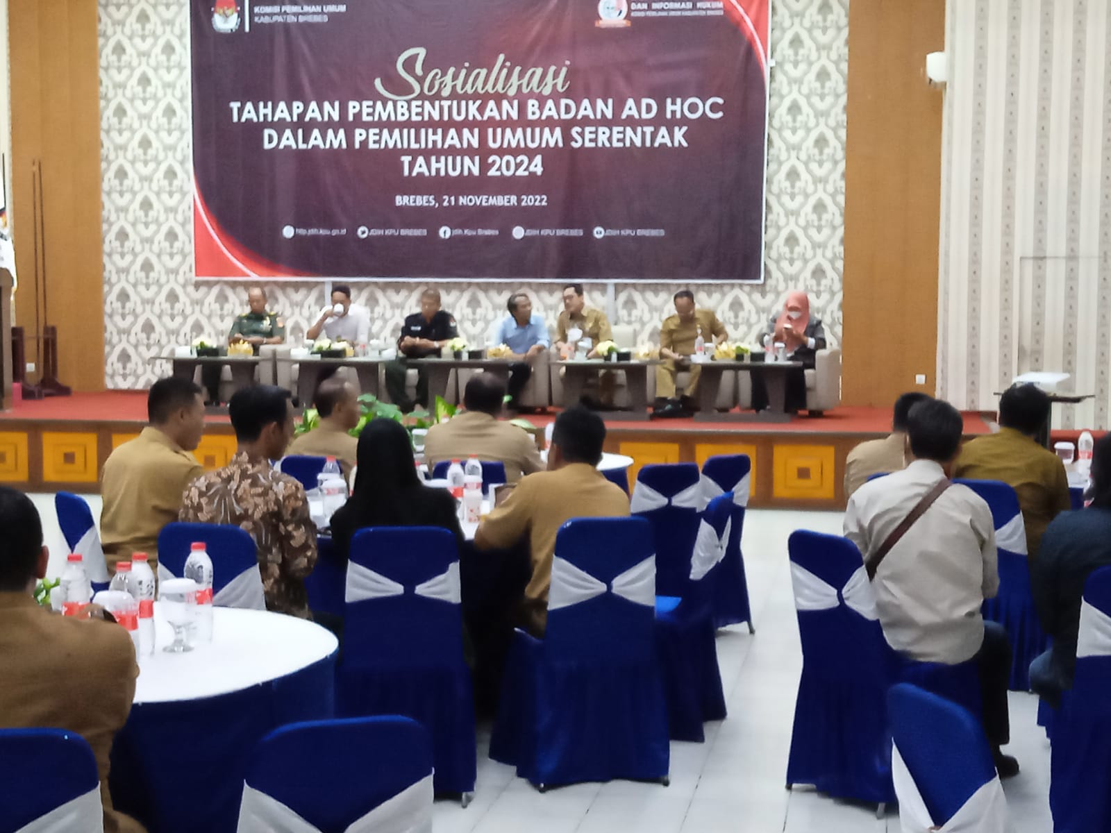 BREBES – Komisi Pemilihan Umum (KPU) Kabupaten Brebes menggelar acara Sosialisasi Tahapan Pembentukan Badan Ad Hoc dalam Pemilihan Umum Serentak Tahun 2024 di gedung pertemuan Hotel Dedy Jaya Brebes, Senin (21/11/2022).
