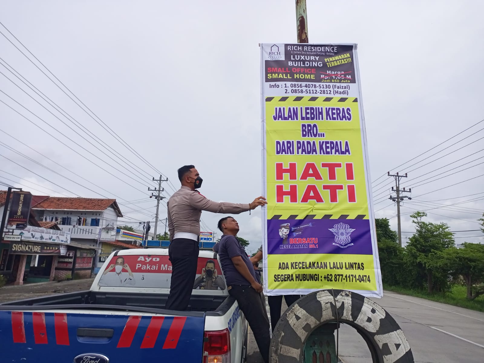 Untuk mengurangi kejadian kecelakaan terulang kembali, ungkap Rizky, dan juga sebagai bentuk kepedulian terhadap pengguna jalan, pihaknya memasangi papan himbauan agar kecelakaan lalulintas tidak terulang kembali.