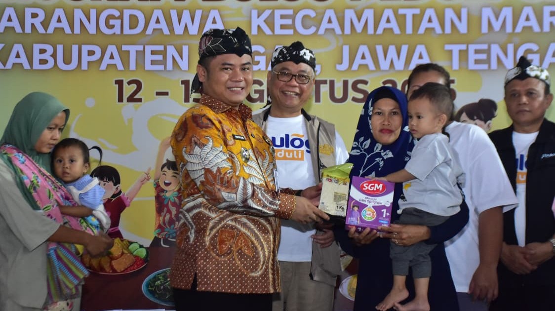 Margasari – Bupati Tegal Ischak Maulana Rohman salurkan bantuan beras fortivit atau beras yang diperkaya dengan vitamin dan mineral dan susu formula kepada 125 anak balita berisiko stunting di Desa Karangdawa, Kecamatan Margasari, Selasa (12/08/2025).