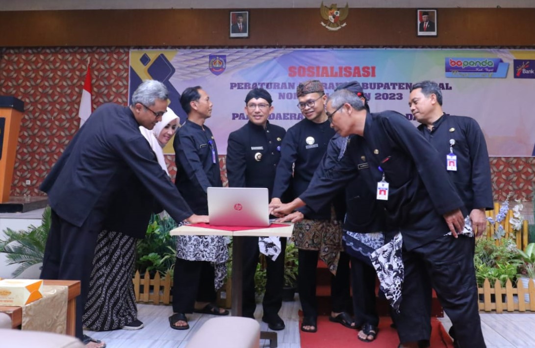 Pj Bupati Tegal Agustyarsyah (tengah) bersama sejumlah pejabat di lingkungan Pemerintah Kabupaten Tegal secara simbolis meluncurkan gerakan Satu Hari Satu Data pada acara Sosialisasi Peraturan Daerah Kabupaten Tegal Nomor 11 Tahun 2023 tentang Pajak Daerah dan Retribusi Daerah di Hotel Grand Dian Slawi, Kamis (18/01/2024).
